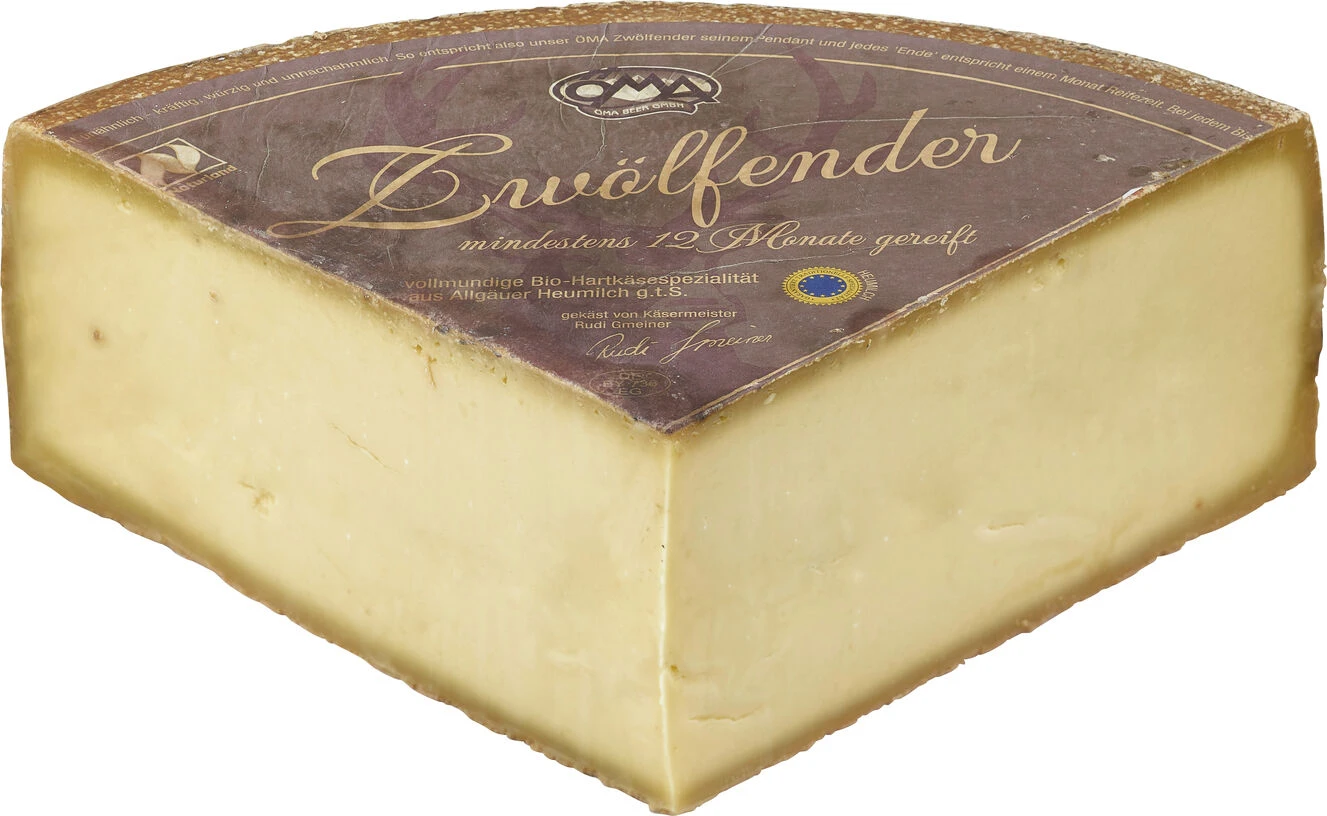 Erkunde die Tiefe des Geschmacks mit dem ÖMA Zwölfender, einem Hartkäse, der während seiner 12-monatigen Reifezeit im Allgäu zu einem kräftig-würzigen Geschmackserlebnis heranreift. Dieser laktosefreie Rohmilchkäse, inspiriert von der Stärke und Würze der Natur, erinnert mit jedem Bissen an die Frische von Gras und das Aroma von würzigem Heu. Perfekt für alle, die sich nach einem Stück echter, traditioneller Käsekunst sehnen.