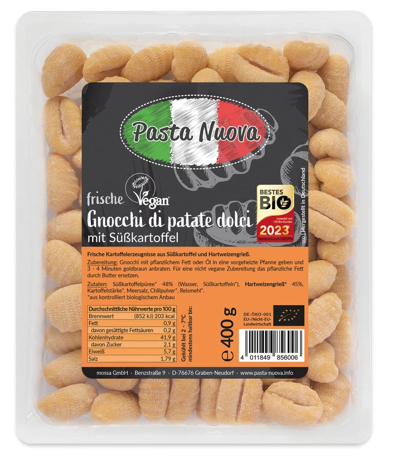 Erwecke deine Küche zum Leben mit den frischen, veganen Süßkartoffel-Gnocchi von Pasta Nuova. Diese köstlichen, pfannenfertigen Gnocchi vereinen den einzigartigen Geschmack von Süßkartoffeln mit der Bequemlichkeit schneller Zubereitung. Perfekt für ein schnelles Abendessen oder als kreative Basis für deine Lieblingssoße oder Pesto. Entfalte mit jedem Bissen die Vielfalt der veganen Küche und genieße ein Gericht, das ebenso sättigend wie geschmackvoll ist.