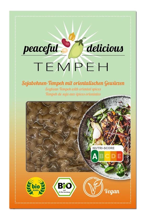 Bereite dich auf ein kulinarisches Abenteuer vor mit dem peaceful delicious Sojabohnen Tempeh, gewürzt mit exotischen orientalischen Aromen. Dieser Fleischersatz, reich an Proteinen und hergestellt aus fermentierten Sojabohnen, ist die ideale Wahl für eine bewusste Ernährung. Seine feste Textur und das tiefe Geschmacksprofil machen ihn zum perfekten Star in deinen vegetarischen und veganen Gerichten. Verwandle deine Mahlzeiten in ein Fest für die Sinne und genieße die Vielfalt, die dieser Tempeh in deine Küche bringt.